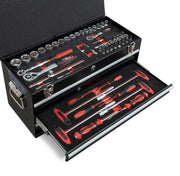 Professionell motorcykelverktygslåda från Weber med 3 lådor, gångjärnslock och 104 verktyg för dagligt bruk i verkstaden.